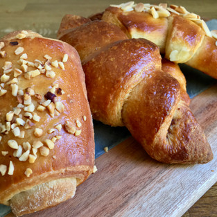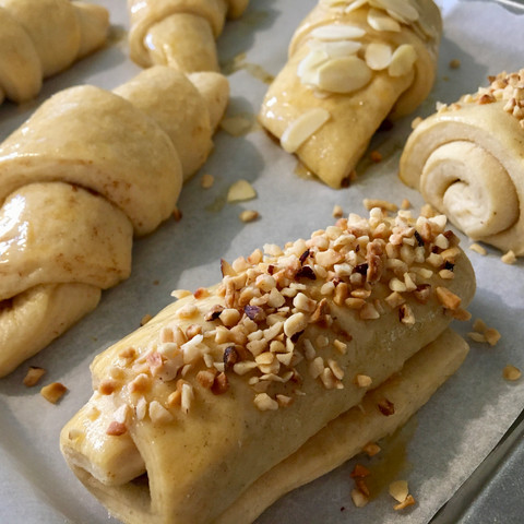 The most common variations are almond or hazelnut croissants. Traditionally these are made with day-old croissants and almond or hazelnut cream. If you don't want to wait and want a cheat option, you can simply add some hazelnut or almond butter. Place a small dollop at the top of your croissants before you roll. To finish, scatter with flaked almonds or chopped hazelnuts just before baking. You can, of course, do this with any nut butter including pistachio or peanut butter, or even hazelnut chocolate spread. Yum!