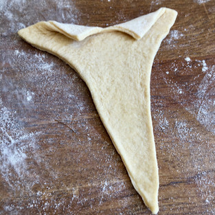 5. Next, take your triangle of dough and hold it up by the end with the cut. Place your fingers behind the dough and your thumb in front. Gently move your fingers and thumb down to the point of the triangle at the bottom to stretch it. You can now put it down again so that this point faces you.